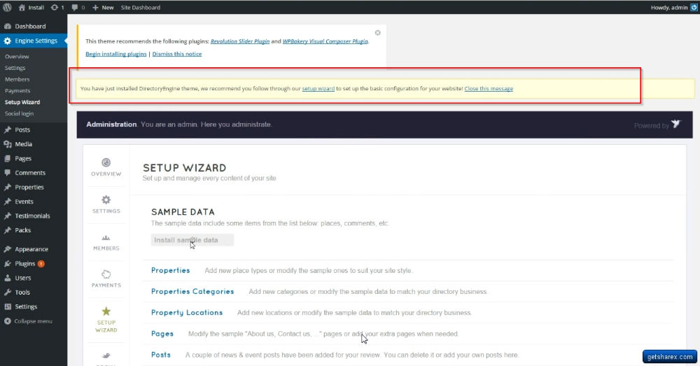 • Choose Engine settings > Set up wizard > Install sample data • Or you can also click “Set up wizard” notification in the red box like the screenshot below and then hit “install sample data”.