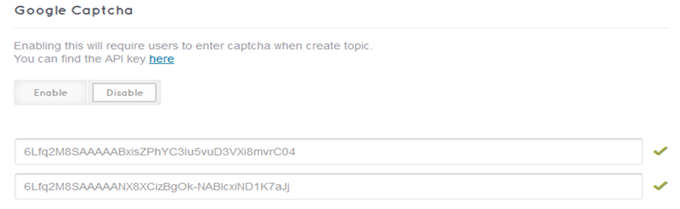 To require users that must enter captcha when creating the topic, click on [Enable]. Otherwise, click on [Disable]