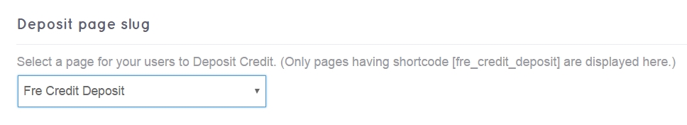 hen, set up the deposit page slug by selecting a page in the dropdown menu (only pages having shortcode [fre_credit_deposit] are displayed).