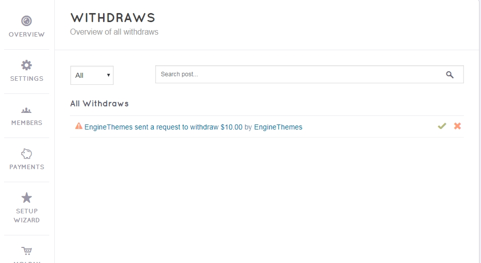 As a site admin, you will navigate to Engine Settings > Withdraws to check or confirm the requests.