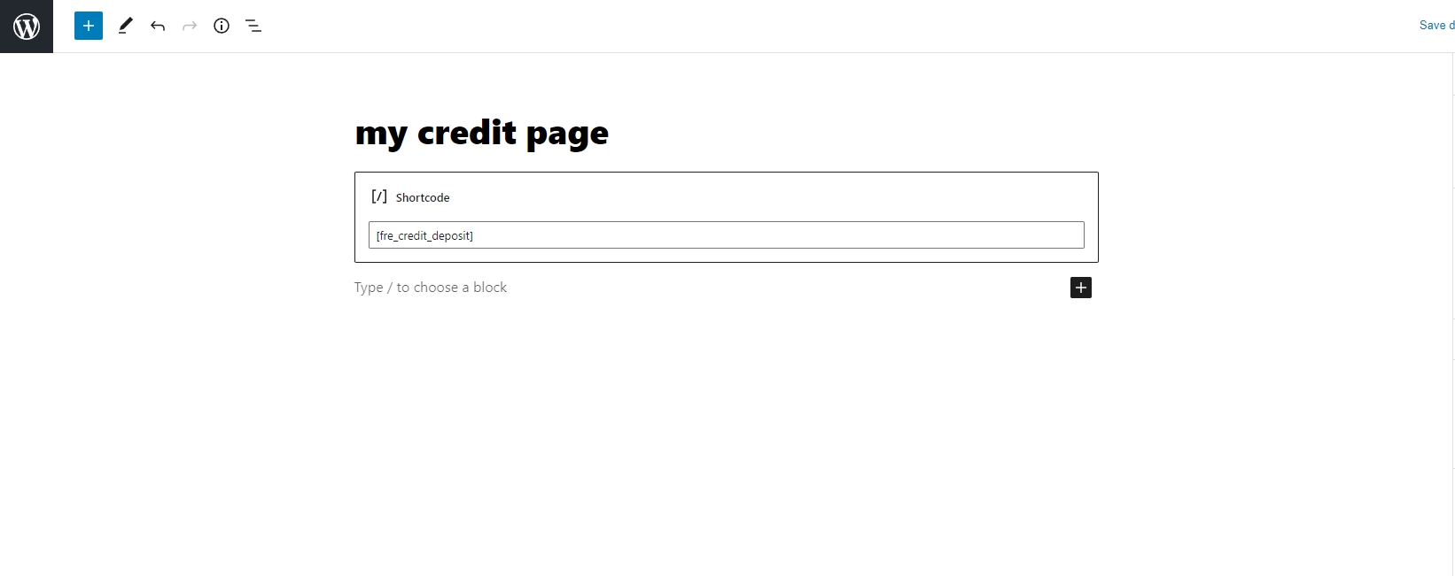 In order to create a deposit page, you go to Pages > Add new and copy the shortcode [fre_credit_deposit] onto the content field as the image below: