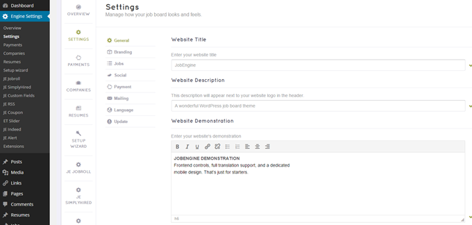 You can set up the main information for your site in two tabs: General and Branding. Choose Engine settings > Settings and you can see them. In these two tabs, you can insert the Website title, description and upload the logos. You can come back later once complete all the main settings.