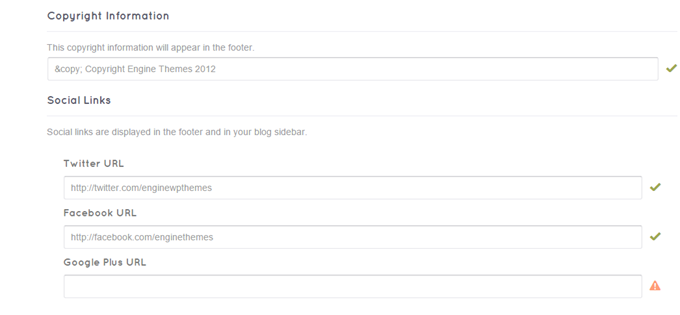 Social link: insert the Url of your Facebook, Twitter, GooglePlus so your user can contact you through social page. They will appear in the footer and your blog sidebar.