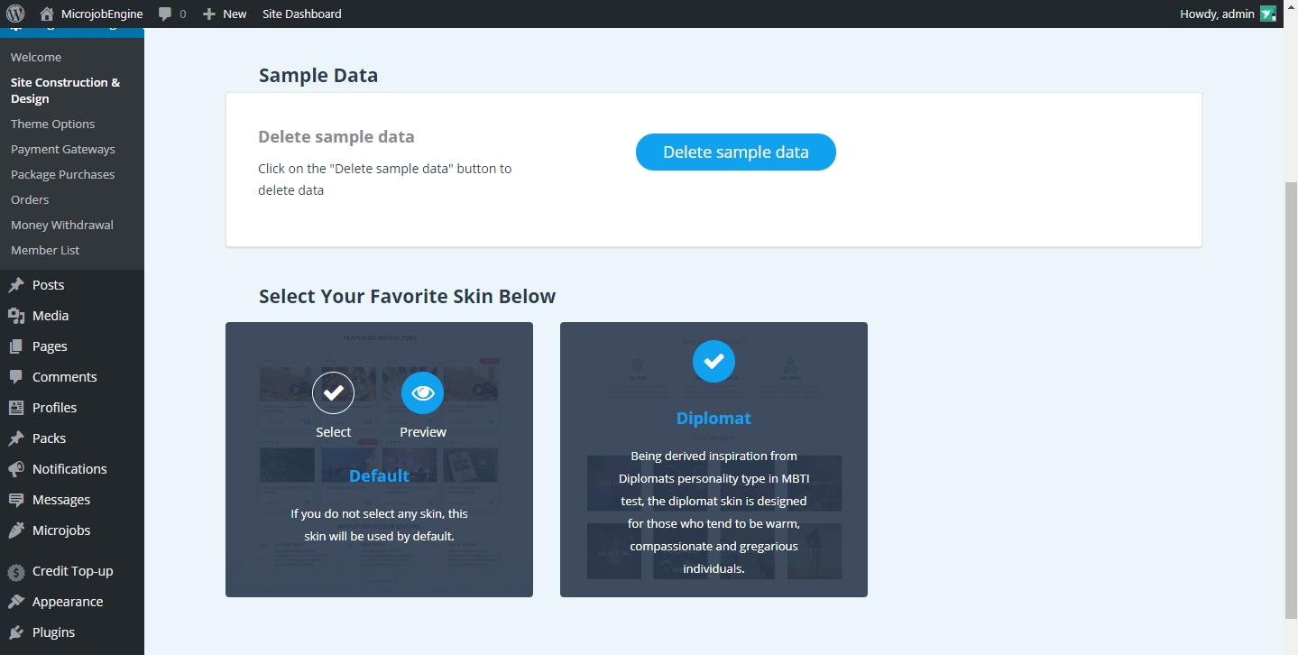 Once you have activated your theme, you will be redirected to the MicrojobEngine Welcome Page to install your sample data.