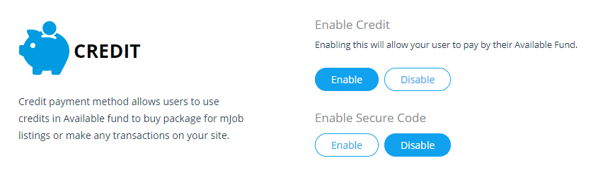 Beside other payment gateways such as PayPal, Credit is a method payment allowing users to use credits in Available fund to pay for orders and mJob listings.