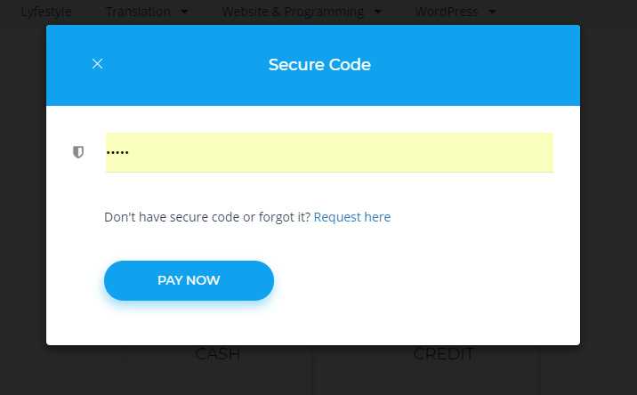 Users use the same Secure code for withdrawal request and for credit payment. If users have requested a secure code before, they also use that code in this step. But if they don’t remember it, just Request a new one pressing “Request here” like in the picture and the code is sent to user’s email.