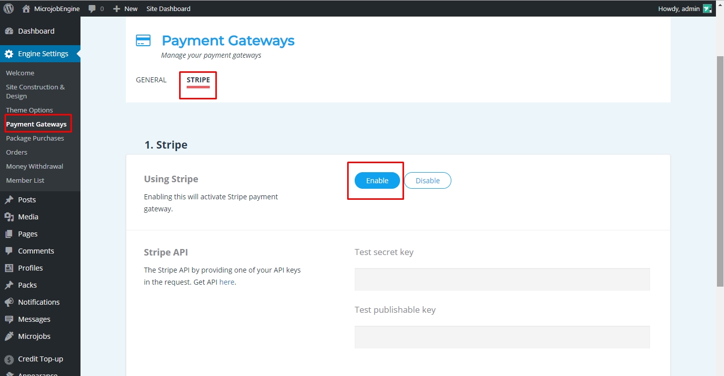 From your Dashboard, go to Engine settings → Payment Gateway → Stripe.