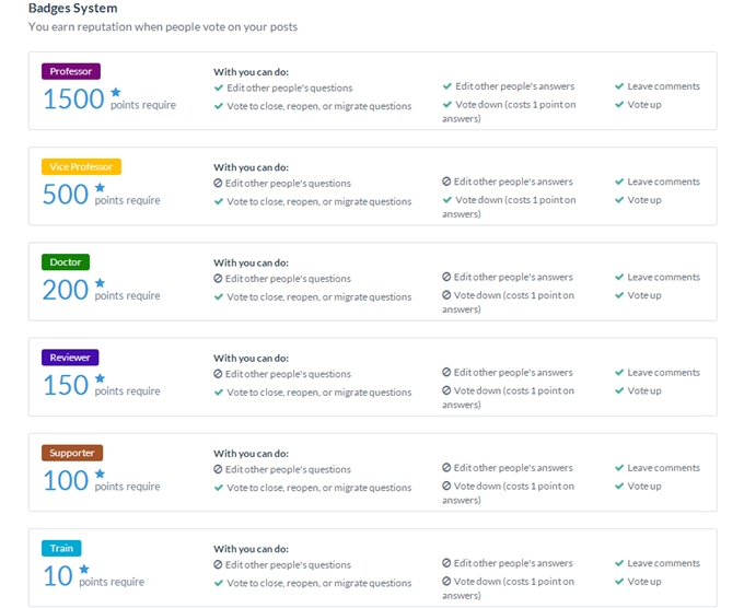 There are some extra actions which users can do only when they achieve some specific points. This section allows you to set up this points system, you can insert the points you want users to get before they can have some specific privileges. How many points a user have to get before they can: - Vote up a question/ answer. - Leave comments on other people’s posts. - Vote down a question/ answer. - Add new tags to the site. - Edit any question. - Edit any answer. Ex: If you want a user have to gain 10 points before they can leave comments, simply insert 10 in the “Leave comments on other people’s post” field.