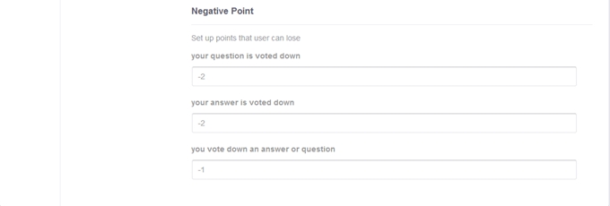 You can decide how many points a user can gain when: - Their question is voted down. - Their answer is voted down. - They vote down an answer or question. Ex: If you want users lose 2 points when their question is voted down, simply insert -2 in the “your question is voted down” field